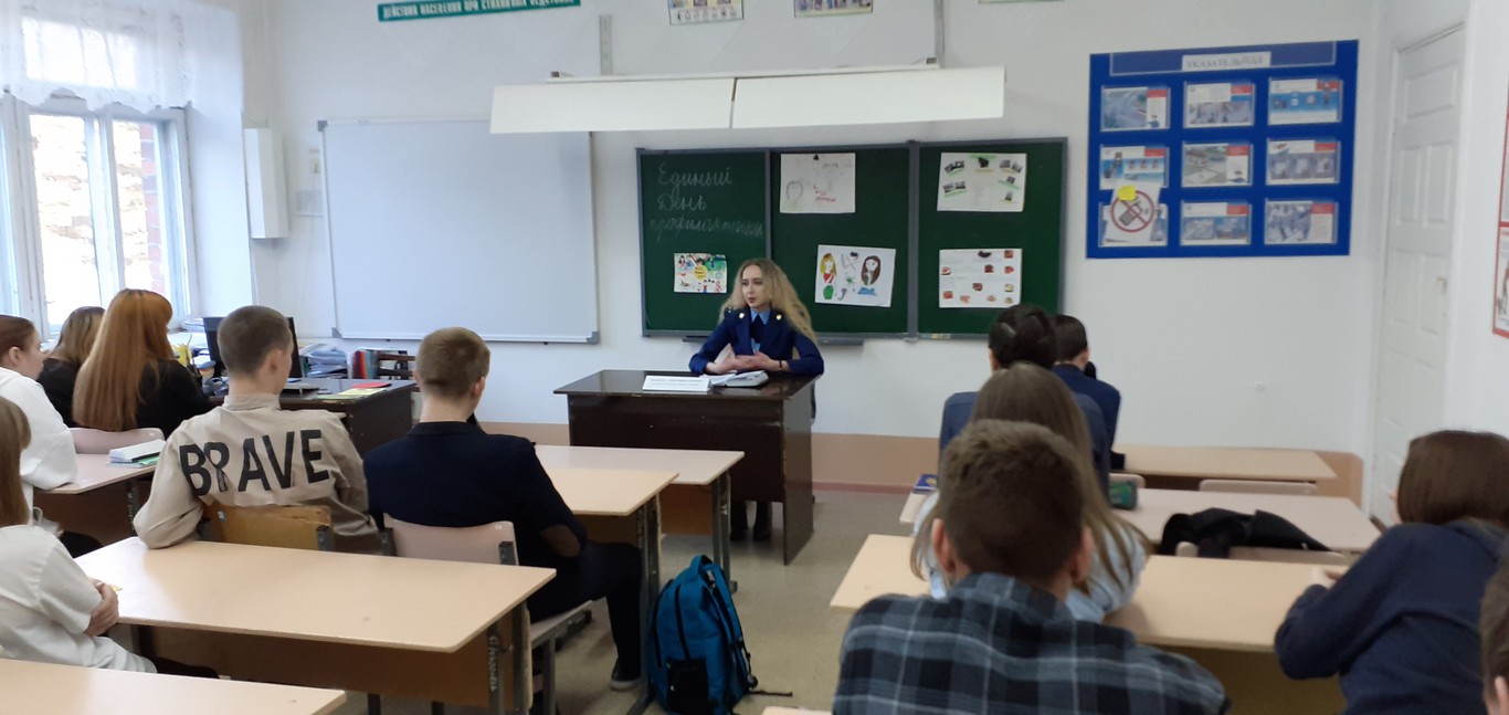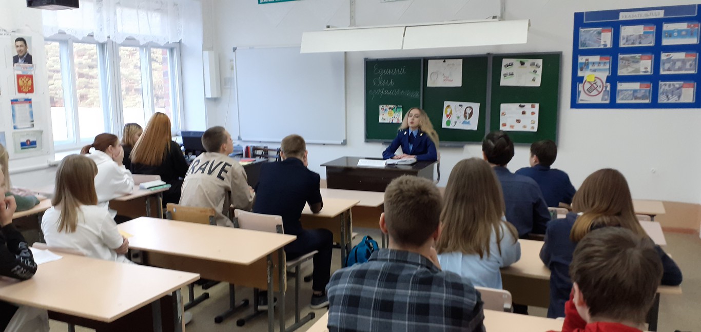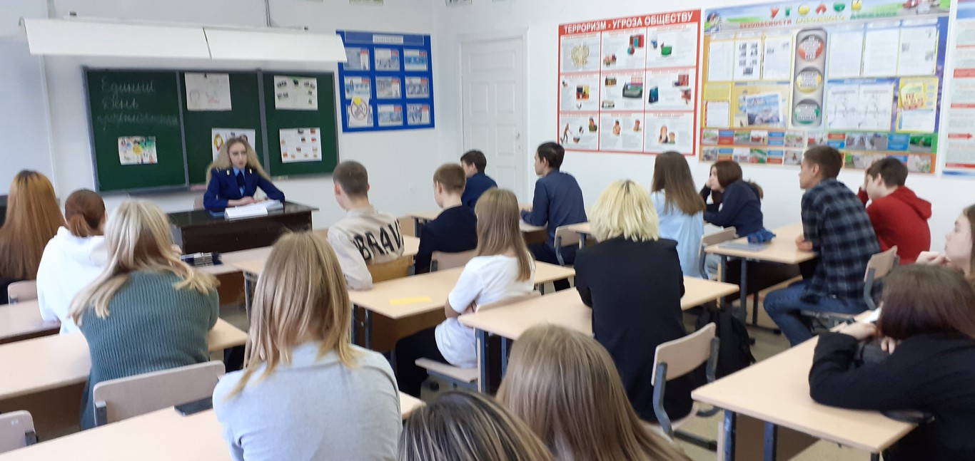 1)Встреча с помощником прокурора. Проведена беседа «Уголовная ответственность несовершеннолетних. Ответственность за употребление психотропных веществ и наркотических средств. Колумбайн и скулшутинг – опасные деструктивные явления», для обучающихся 8-9 классов.