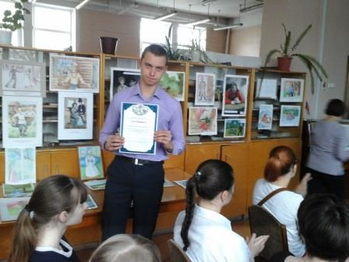 С целью привлечения и развития интереса к творчеству классики русской литературы обучающиеся 8 класса МБОУ СОШ № 6 Кошеляк Илья, Мергенова Анора приняли участие в муниципальном творческом конкурсе «Мир героев Тургенева», посвященного 200- летию со дня рождения И.С.Тургенева. Илья нарисовал рисунок к произведению «Муму», Анора к произведению «Ася». 08 мая 2018 году были приглашены на подведение итогов конкурса в библиотеку имени А.С.Пушкина, где им за участие сотрудники библиотеки вручили сертификаты участника.