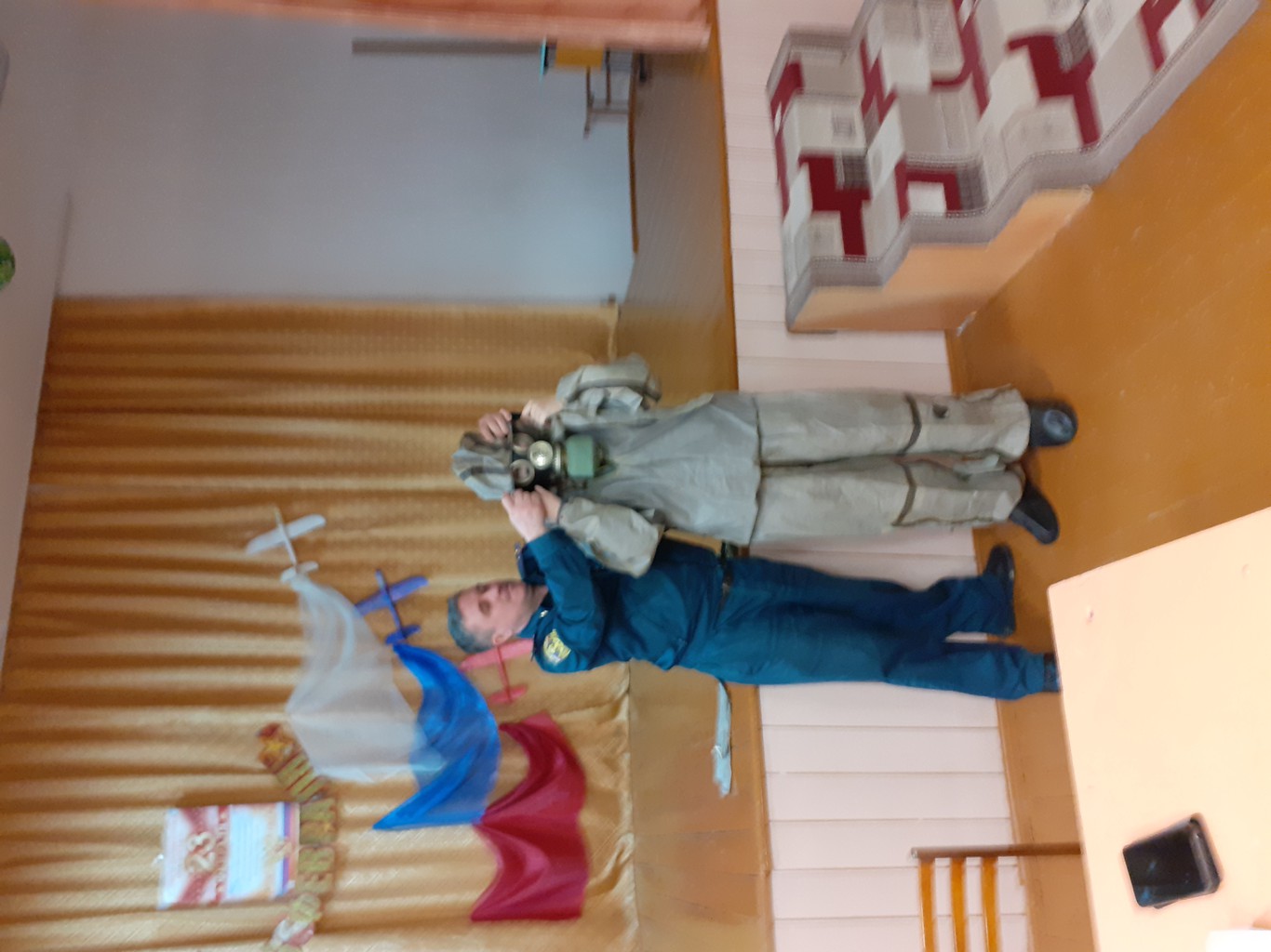 Начальник караула Виктор Николаевич Блинов познакомил ребят с историей праздника и напомнилприсутствующим номера вызова экстренных служб, провел практикум по надеванию ОЗК, противогаза.