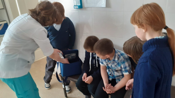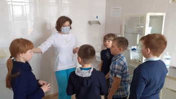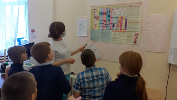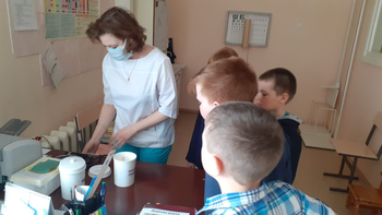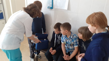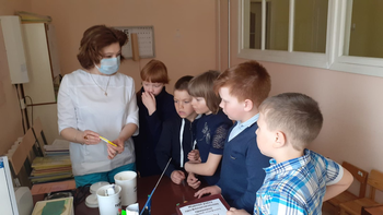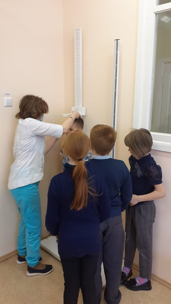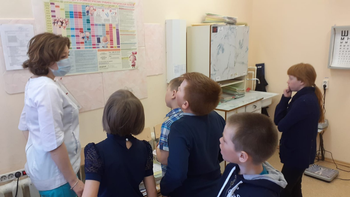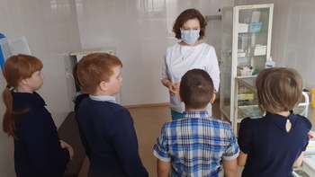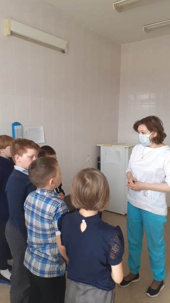 18.04.2022г. экскурсия в кабинет школьного фельдшера Анны Васильевны Воровщиковой. Она показала ребятам процедурный кабинет, рассказала о прививках, которые нужно ставить детям, познакомила с календарем прививок, показала сумку ,в которой она привозит вакцины для детей, показала лед для перевозки лекарств, таблицу для проверки зрения, ростометр, весы;