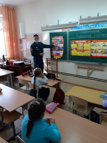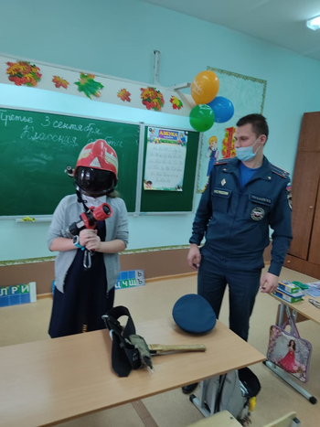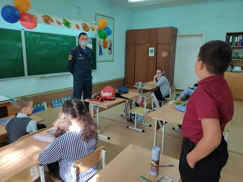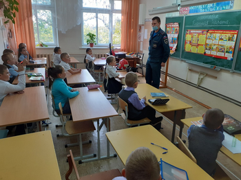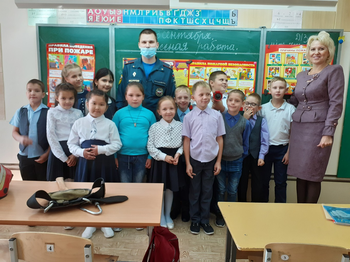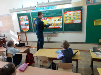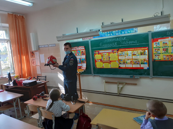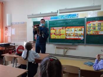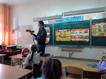 Данный урок проводился в формате бесед, викторин, учебных тренировок. Виталий Владимирович показал и рассказал о первичных средствах пожаротушения, об одежде пожарного, о инструментах, необходимых на пожаре, ученикам начальной школы дал примерить на себя элементы одежды пожарного, что очень понравилось и запомнилось ребятам.
