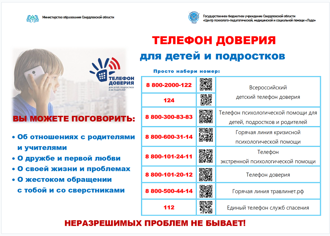 Телефон доверия экстренной психологической помощи министерства здравоохранения Свердловской области: 8 800 300-11-00, для взрослых; 8 800 300-83-83, для детей и подростков (круглосуточно, бесплатно).