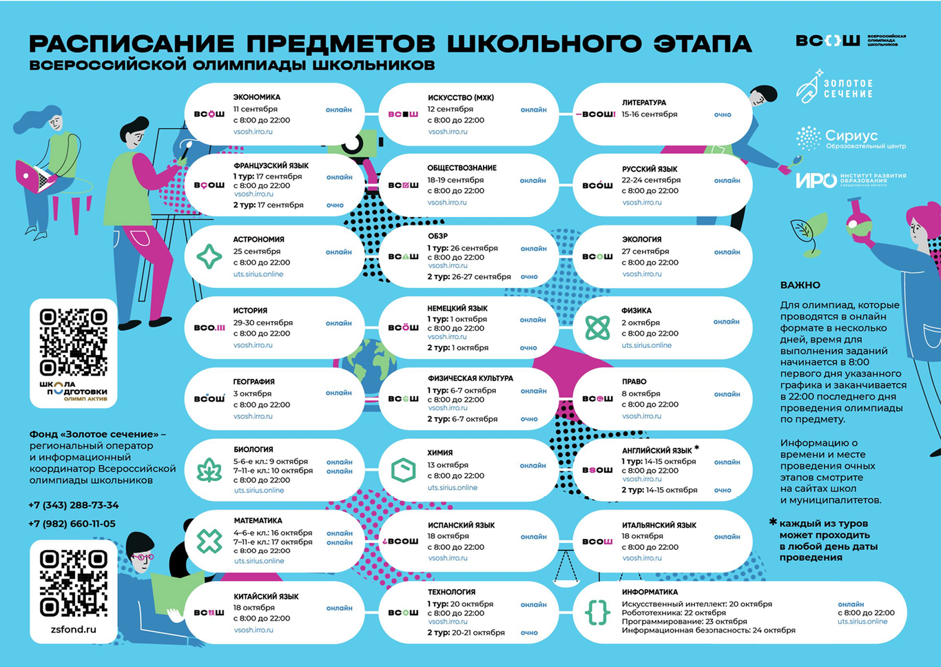С 8 по 19 сентября пройдет серя вебинаров по 24 предметам для организаторов, представителей предметно-методических комиссий, членов жюри и апелляционных комиссий школьного и муниципального этапов состязания. Узнать о датах и времени проведения вебинаров, а также зарегистрироваться на мероприятие можно на сайте олимпиады.